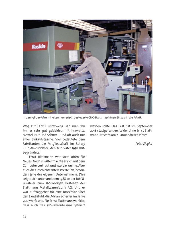 Ernst Blattmann war stets offen für Neues. Noch im Alter machte er sich mit dem Computer vertraut und war viel online. Aber auch die Geschichte interessierte ihn, besonders jene des eigenen Unternehmens. Dies zeigte sich unter anderem 1988 an der Jubiläumsfeier zum 150-jährigen Bestehen der Blattmann Metallwarenfabrik AG. Und er war Auftraggeber für eine Broschüre über den Landistuhl, die Adrian Scherrer im Jahre 2007 verfasste. Für Ernst Blattmann war klar, dass auch das 180-Jahr-Jubiläum gefeiert werden sollte. Das Fest hat im September 2018 stattgefunden. Leider ohne Ernst Blattmann. Er starb am 2. Januar dieses Jahres.