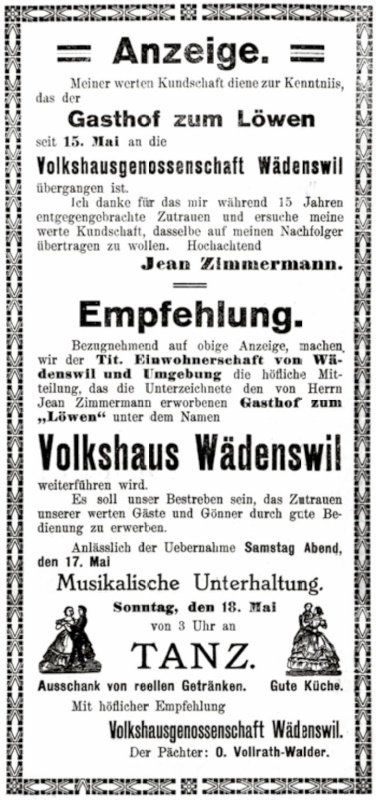 2 Alfred Nicolai. Aus der Geschichte des Volkshauses. In: Jahrbuch der Stadt Wädenswil 1981, S. 69–73; Archiv Volkshausgenossenschaft (VHG), Protokoll der konstituierenden Sitzung der Volkshausgenossenschaft Wädenswil, 29.3.1919; Allgemeiner Anzeiger vom Zürichsee (AAZ), 16.5.1919; AAZ, 23.5.1919.