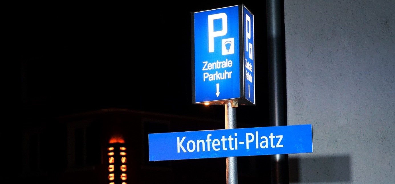 Christoph Lehmann, Präsident der Neuen Fasnachtsgesellschaft, erklärte an der Vernissage scherzhaft, dass Stadtgründer Wadin wahrscheinlich hier mal seinen Hof hatte. «Wir von der NFG diskutierten immer, wie man diesen Platz benennen solle: Lindenplatz? Alte-Gewerbeschule-Platz? Alte-Sekundarschule-Platz? Und nun haben wir diesem Platz einen Namen gegeben: er heisst ab jetzt Konfetti-Platz!» Und so enthüllte er unter Beifall der anwesenden Zuschauer das Strassenschild, das dem Platz künftig den Namen Konfetti-Platz gibt.