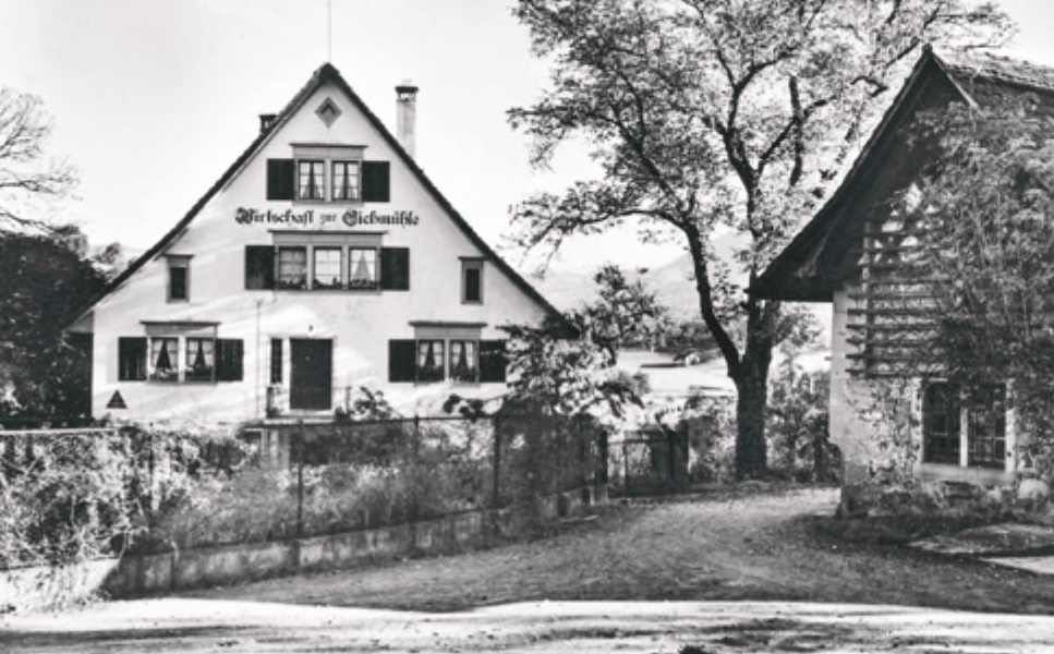 Da niemand Interesse zeigte, die Liegenschaft Eichmüli gesamthaft oder teilweise zu erwerben, wurde im Jahre 1880 Albert Blattmann (1849–1920)62, der einzige Sohn von Jakob Blattmann, neuer Eigentümer der oben angeführten Gebäude und der Grundstücke. 1918 verkaufte Albert Blattmann das Wohnhaus Eichmüli, in welchem er schon 1908 die elektrische Beleuchtung hatte installieren lassen, dem Malermeister Anton Vinatzer.63 Dieser empfahl sich 1923 im «Allgemeinen Anzeiger vom Zürichsee» für seinen Taxameter-Betrieb, erreichbar über Telefon Nummer 222. 1924 richtete Vinatzer in der Eichmüli einen Restaurantbetrieb ein und nannte sich fortan Wirt. 1927 wurde Hans Konrad Bosshard Eigentümer der Wirtschaft. 1928 liess er im Keller zwei Fischtröge einrichten und spezialisierte sich auf Fischgerichte. Im «Offiziellen Automobilführer der Schweiz», Ausgabe 193564, warb er für sein Restaurant Eichmühle: «Hans Bosshard, Inhaber – selbstgeführte soignierte Küche – alle Saison-Spezialitäten – erstklassige Weine – lebende Fische – Tel. Wädenswil 444»