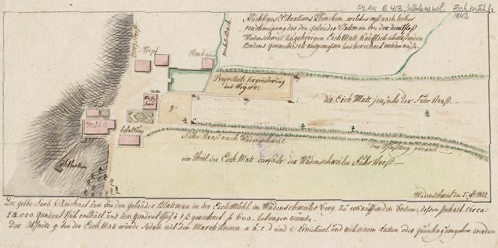 87 Plan des Hofes Eichmühle von 1842 mit allen Nebengebäuden: Er entstand, als der Weiher in der Eichmatte vergrössert werden sollte.