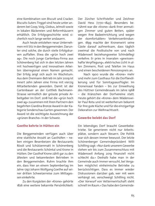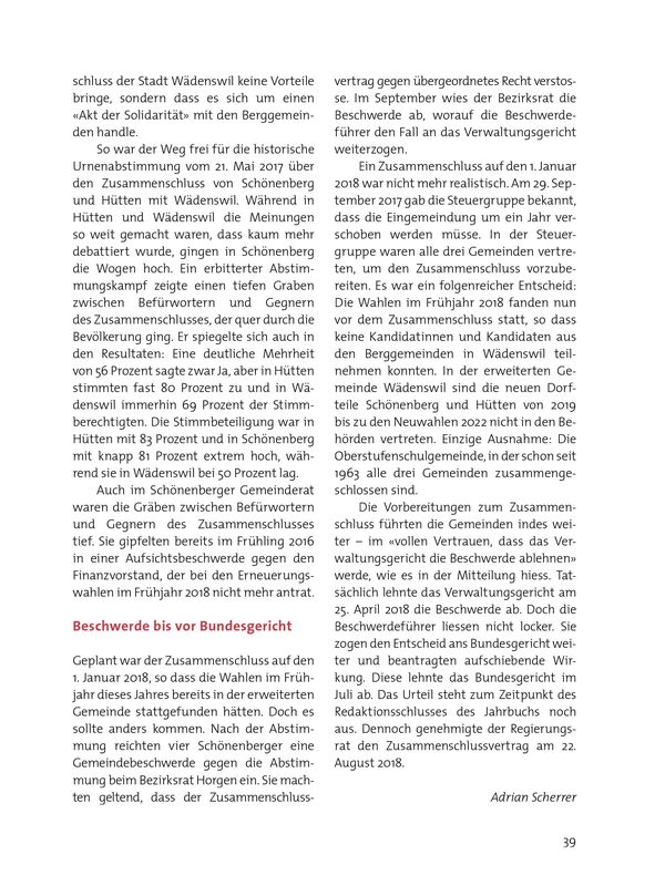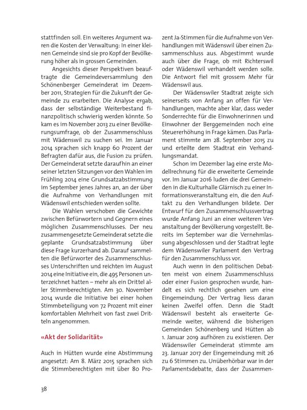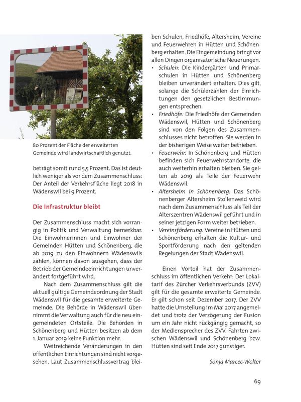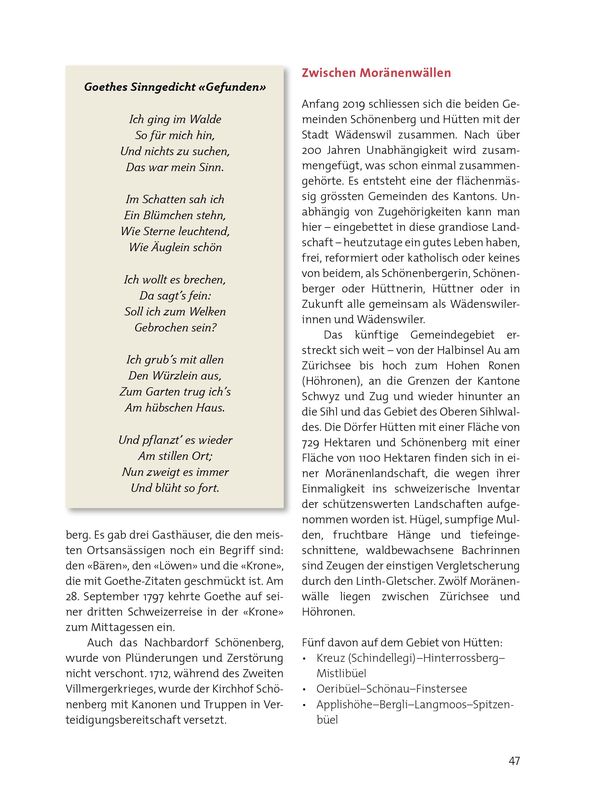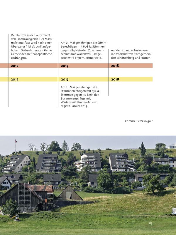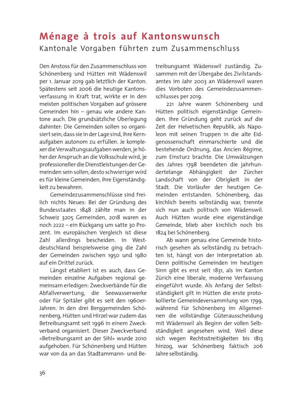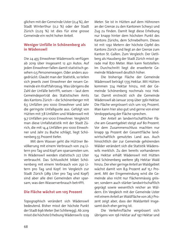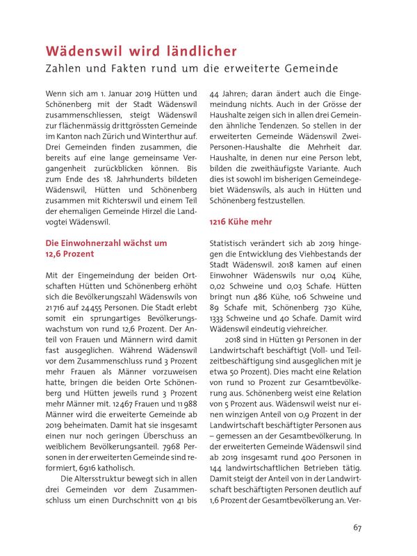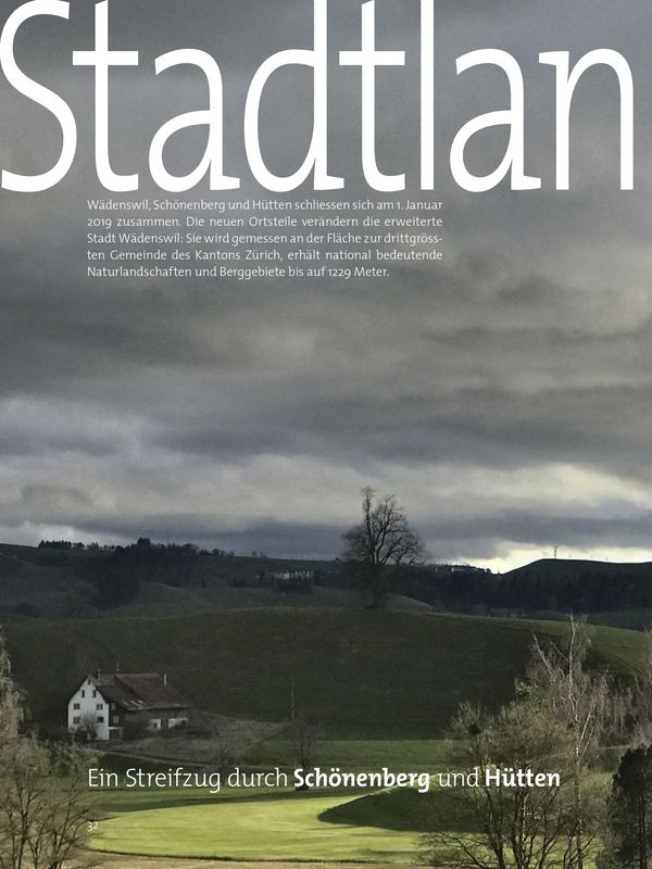 Wädenswil, Schönenberg und Hütten schliessen sich am 1. Januar 2019 zusammen. Die neuen Ortsteile verändern die erweiterte Stadt Wädenswil. Sie wird gemessen an der Fläche zur drittgrössten Gemeinde des Kantons Zürich, erhält national bedeutende Naturlandschaften und Berggebiete bis auf 1229 Meter.
