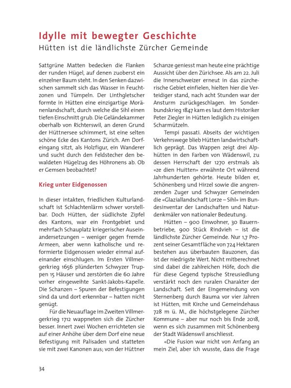 Hütten – 900 Einwohner, 30 Bauernbetriebe, 900 Stück Rindvieh – ist die ländlichste Zürcher Gemeinde. Nur 1,7 Prozent seiner Gesamtfläche von 724 Hektaren bestehen aus überbauten Bauzonen, das ist der niedrigste Wert. Nicht mitberechnet sind dabei die zahlreichen Höfe, doch die für diese Gegend typische Streusiedlung verstärkt noch den ruralen Charakter der Landschaft. Seit der Eingemeindung von Sternenberg durch Bauma vor vier Jahren ist Hütten, mit Kirche und Gemeindehaus 728 m ü. M., die höchstgelegene Zürcher Kommune – aber nur noch bis Ende 2018, wenn es sich zusammen mit Schönenberg der Stadt Wädenswil anschliesst.