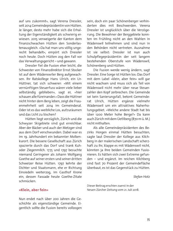 Als alle Gemeindepräsidenten des Bezirks Horgen einmal Hütten besuchten, sagte laut Dressler der Kollege aus Kilchberg in der malerischen Landschaft scherzhaft zu ihr, klappe es mit Wädenswil nicht, könnten ja ihre beiden Gemeinden fusionieren. Es hätten sich zwei Extreme gefunden – und ergänzt. Im reichen Kilchberg sind fast 70 Prozent der Gemeindefläche überbaut, es ist das Gegenstück zu Hütten.