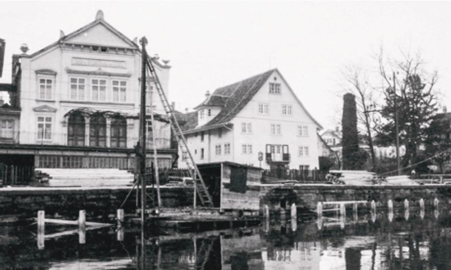 113b Das Haus «zum alten Engel» (rechts), aufgenommen 1925 während des Doppelspurausbaus der Bahnlinie. Die Lage am See prägte die Begeisterung der Kägis für das Rudern.
