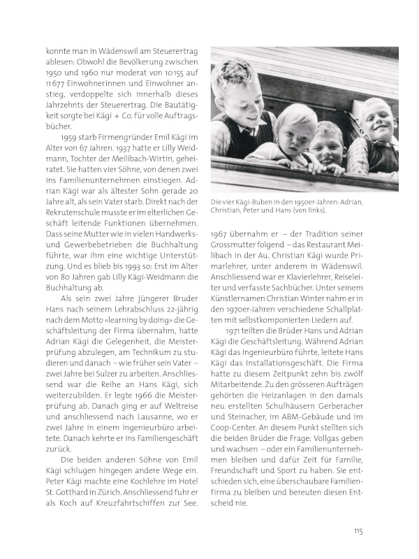 1959 starb Firmengründer Emil Kägi im Alter von 67 Jahren. 1937 hatte er Lilly Weidmann, Tochter der Meilibach-Wirtin, geheiratet. Sie hatten vier Söhne, von denen zwei ins Familienunternehmen einstiegen. Adrian Kägi war als ältester Sohn gerade 20 Jahre alt, als sein Vater starb. Direkt nach der Rekrutenschule musste er im elterlichen Geschäft leitende Funktionen übernehmen. Dass seine Mutter wie in vielen Handwerks- und Gewerbebetrieben die Buchhaltung führte, war ihm eine wichtige Unterstützung. Und es blieb bis 1993 so: Erst im Alter von 80 Jahren gab Lilly Kägi-Weidmann die Buchhaltung ab.