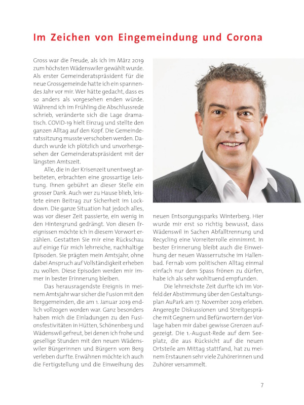 Das herausragendste Ereignis in meinem Amtsjahr war sicher die Fusion mit den Berggemeinden, die am 1. Januar 2019 endlich vollzogen worden war. Ganz besonders haben mich die Einladungen zu den Fusionsfestivitäten in Hütten, Schönenberg und Wädenswil gefreut, bei denen ich frohe und gesellige Stunden mit den neuen Wädenswiler Bürgerinnen und Bürgern vom Berg verleben durfte. Erwähnen möchte ich auch die Fertigstellung und die Einweihung des neuen Entsorgungsparks Winterberg. Hier wurde mir erst so richtig bewusst, dass Wädenswil in Sachen Abfalltrennung und Recycling eine Vorreiterrolle einnimmt. In bester Erinnerung bleibt auch die Einweihung der neuen Wasserrutsche im Hallenbad. Fernab vom politischen Alltag einmal einfach nur dem Spass frönen zu dürfen, habe ich als sehr wohltuend empfunden.