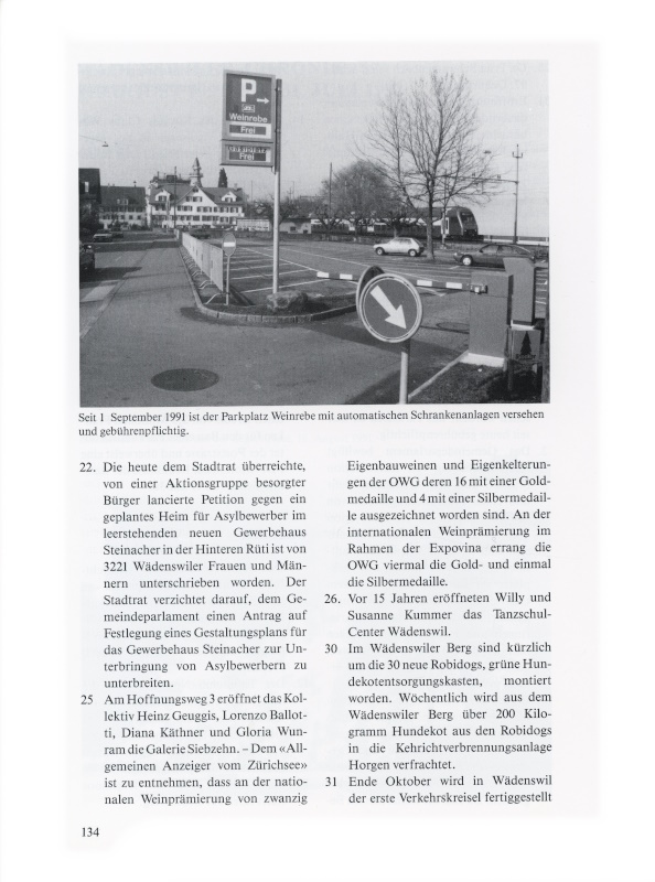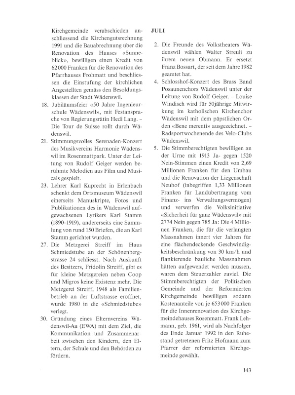 Tuwag-Immobilien-AG in der Industriezone Einsiedlerstrasse 32 (Einbau eines Kindergartens) sowie die Abfallverordnung mit Einführung der Kehrichtsackgebühr. Die Kreditvorlagen betreffend Einrichtung von Sammelstellen und eines zentralen Sammelplatzes für Altmaterial sowie für den Bau einer Kompostieranlage im Grossholz werden an den Stadtrat zurückgewiesen. − Alice Bossard-Blattmann, aufgewachsen an der Florhofstrasse 18, feiert ihren 90. Geburtstag.