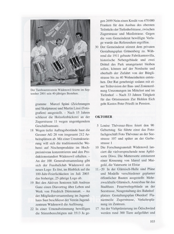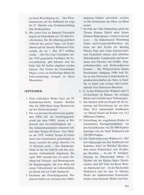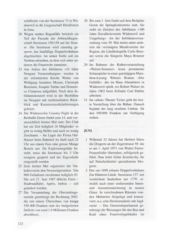 8. Die Versammlung der Evangelisch-reformierten Kirchgemeinde genehmigt das Budget 2003 und belässt den Steuerfuss bei 12 Prozent. – Am 29. Kaltwasserschwimmen im