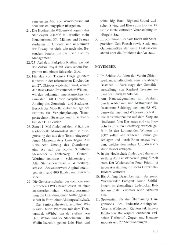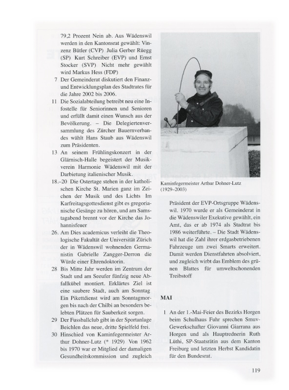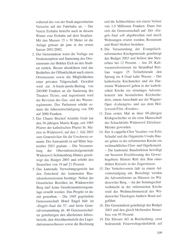 Martin Kopp, seit 1985 Pfarrer der katholischen Pfarrei St. Marien in Wädenswil, auf den 1. Juli 2003 zum Generalvikar für die Urschweiz ernannt. Der Amtsantritt ist auf Mitte September 2003 geplant. – Die Versammlung der Oberstufenschulgemeinde Wädenswil-Schönenberg-Hütten genehmigt das Budget 2003 und erhöht den Steuerfuss von 19 auf 21 Prozent.