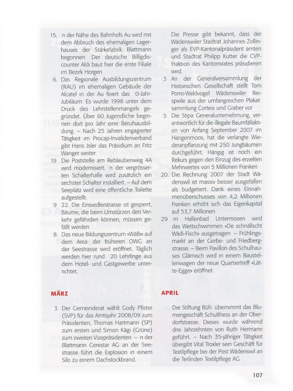 23. Der Gemeinderast genehmigt die Rechnung 2007 und den Geschäftsbericht des Stadtrates für 2007. Mit einem Ertragsüberschuss von 4,2 Millionen Franken gegenüber einem budgetierten Defizit von 6 Millionen Franken wurde 2007 eine Verbesserung von über 10 Millionen Franken erreicht. Gefordert werden im Rat eine künftige Steuersenkung sowie eine realistischere Budgetierung.