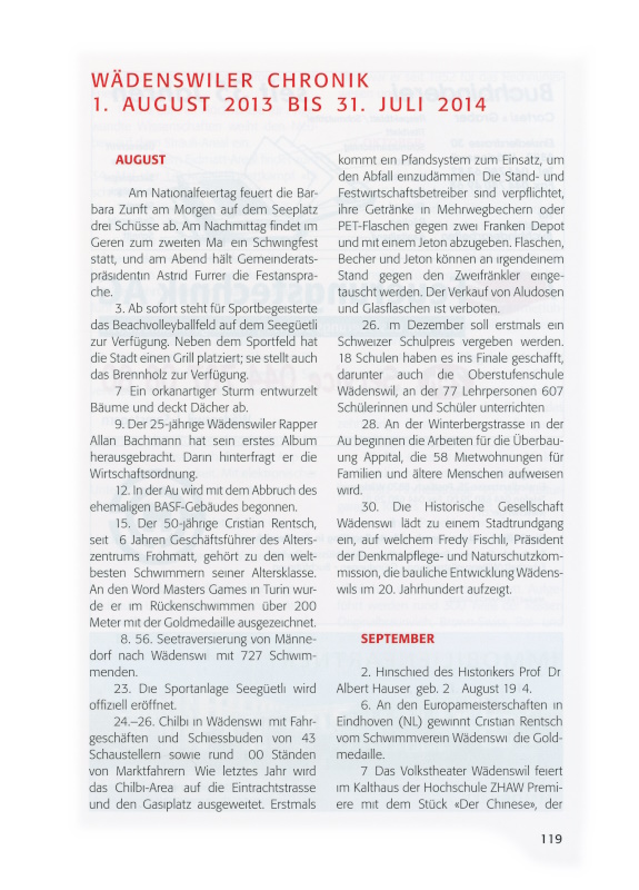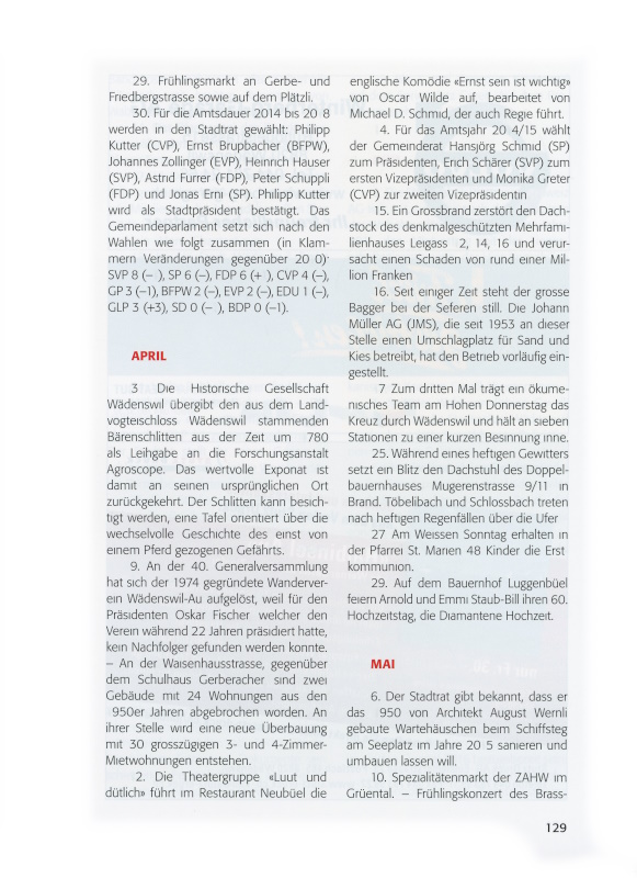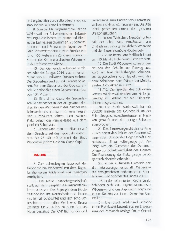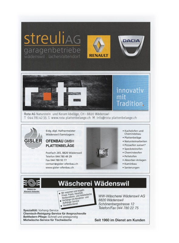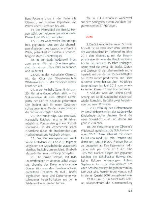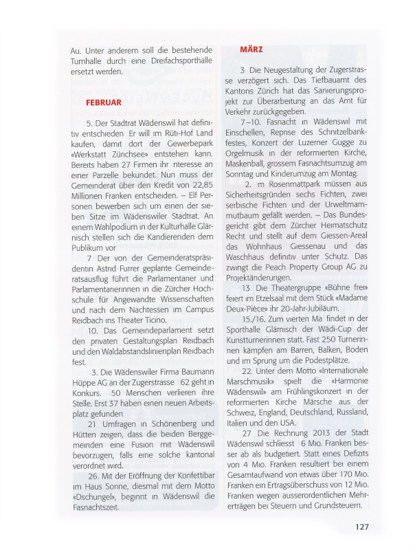 5. Der Stadtrat Wädenswil hat definitiv entschieden: Er will im Rüti Hof Land kaufen, damit dort der Gewerbepark «Werkstatt Zürichsee» entstehen kann. Bereits haben 27 Firmen ihr Interesse an einer Parzelle bekundet. Nun muss der Gemeinderat über den Kredit von 22,85 Millionen Franken entscheiden. – Elf Personen bewerben sich um einen der sieben Sitze im Wädenswiler Stadtrat. An einem Wahlpodium in der Kulturhalle Glärnisch stellen sich die Kandierenden dem Publikum vor.