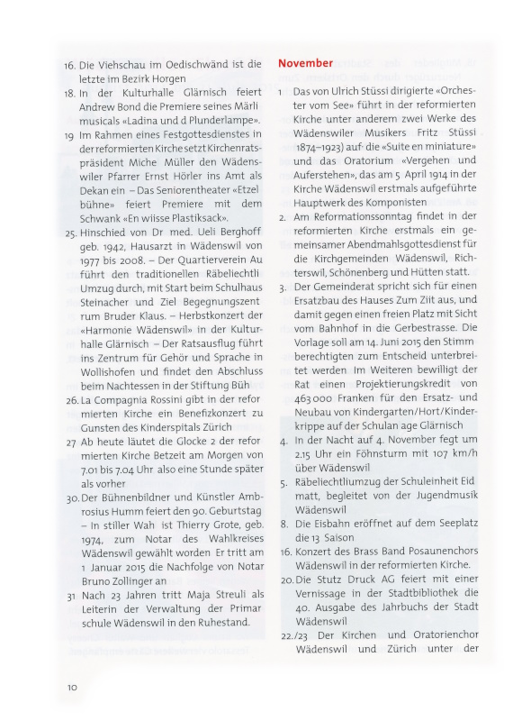 4./5. Der Oberstufenchor Wädenswil unter der Leitung von Zoltán Szalatnay und Andrea Stocker feiert das 20-Jahre-Jubiläum und gibt zusammen mit der Gospel-Legende Edwin Hawkins & His New Edwin Hawkins Singers in der reformierten Kirche zwei Konzerte. Der Chor besteht aus 130 Schülerinnen und Schülern der Oberstufenschule Wädenswil im Alter zwischen zwölf und fünfzehn Jahren, welche den Chor im Rahmen des Wahl- und Freifachangebotes 2014/15 besuchen.