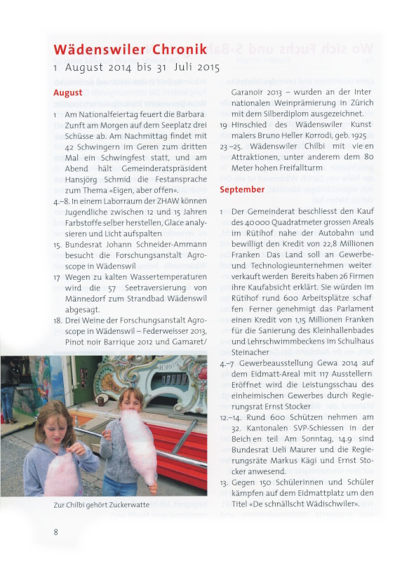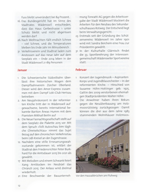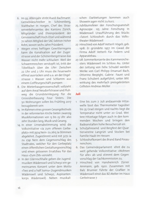 7. Wegen eines heftigen Gewitterregens kann die Kanalisation auf der Zugerstrase und der Schönenbergstrasse das Wasser nicht mehr schlucken. Weil der Schwemmrechen verstopft ist, tritt der Töbelibach über die Ufer. Zwischen 22 Uhr und 2 Uhr muss die Feuerwehr elfmal ausrücken und u.a. an der Engelstrasse 1 Wasser und Schlamm aus einem Coiffeurgeschäft pumpen.
