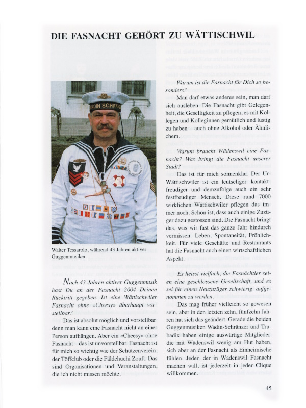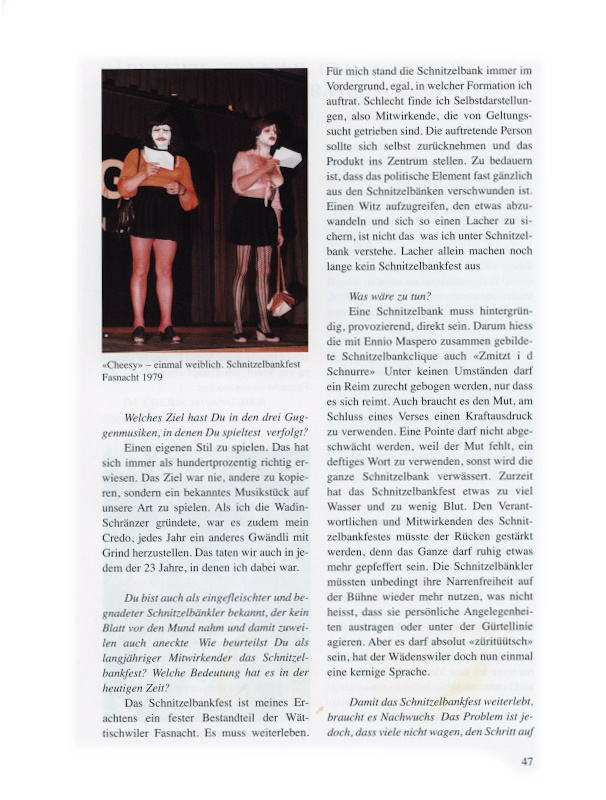 Das Schnitzelbankfest ist meines Erachtens ein fester Bestandteil der Wättischwiler Fasnacht. Es muss weiterleben. Für mich stand die Schnitzelbank immer im Vordergrund, egal, in welcher Formation ich auftrat. Schlecht finde ich Selbstdarstellungen, also Mitwirkende, die von Geltungssucht getrieben sind. Die auftretende Person sollte sich selbst zurücknehmen und das Produkt ins Zentrum stellen. Zu bedauern ist, dass das politische Element fast gänzlich aus den Schnitzelbänken verschwunden ist. Einen Witz aufzugreifen, den etwas abzuwandeln und sich so einen Lacher zu sichern, ist nicht das, was ich unter Schnitzelbank verstehe. Lacher allein machen noch lange kein Schnitzelbankfest aus.