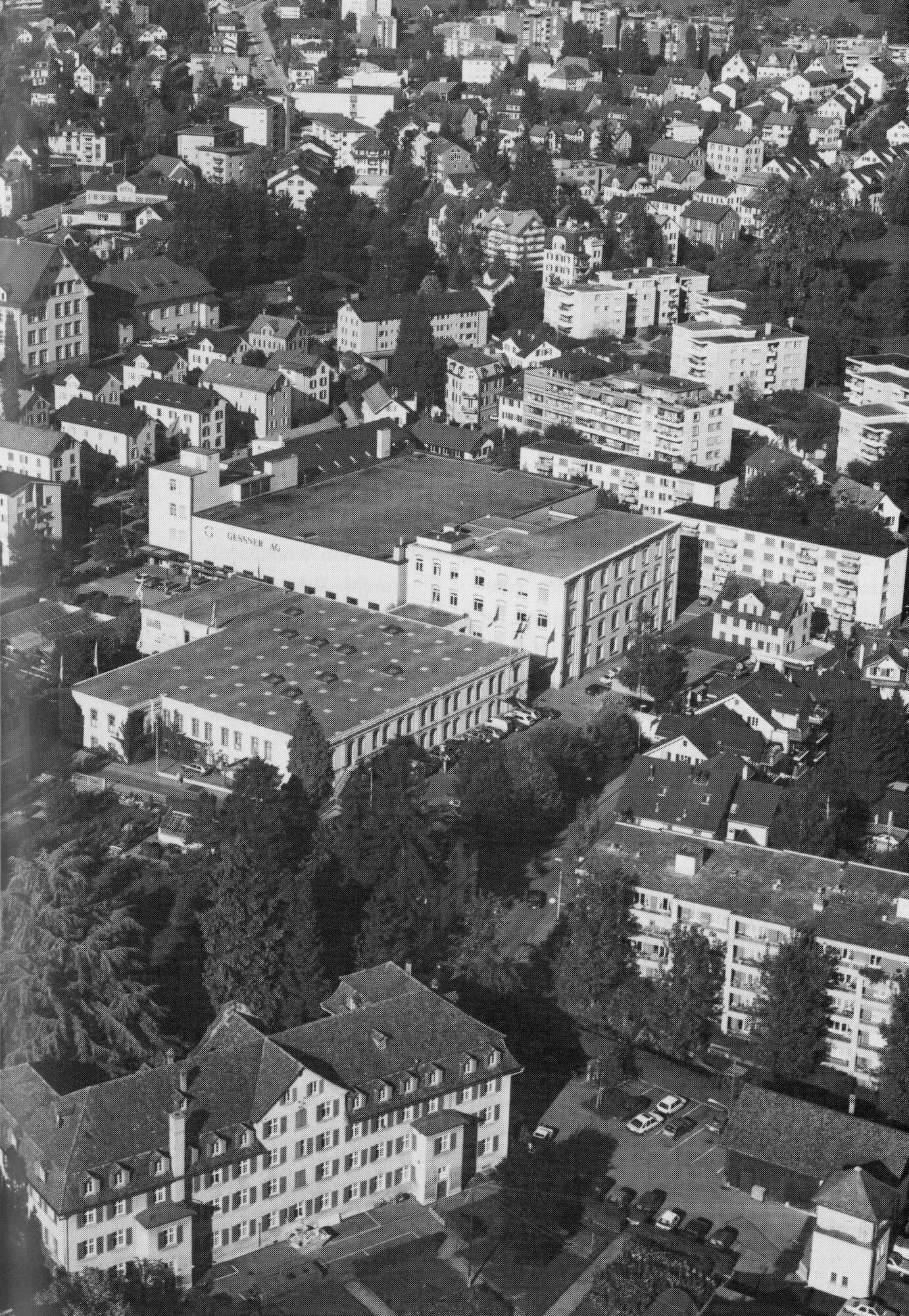 75 Wädenswil 1991. Blick gegen Westen. Im Zentrum die Seidenweberei Gessner AG.