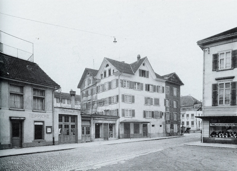 Seestrasse beim «Seehof», Ansicht von Osten, nach 1940. Rechts der «Seehof», im Hintergrund das Sparkasse-Gebäude von 1940. In der Mitte die zusammengebauten Wirtshäuser Pilgerhof und Rosenegg. Links Haus Seestrasse 93 mit der 1926 eingerichteten Werkstätte von Sattler Baumann. [pzi]