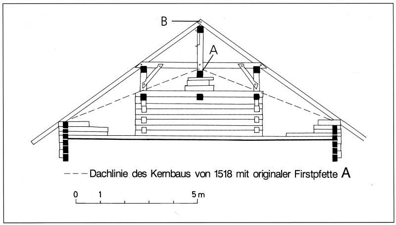 Zeuge einer Baute mit früherer Schindeleindeckung ist das einstige Bauernhaus Büelenstrasse 9, dessen Kernbau mit originaler Firstpfette dendrochronologisch auf 1518 datiert werden konnte.14 Die schwache Neigung – der Winkel an der Pfette beträgt 140 Grad – erinnert daran, dass das Dach ursprünglich mit Brettschindeln gedeckt war, die lose auf den Dachlatten lagen und mit Steinen und waagrecht verlaufenden Stangen beschwert wurden.