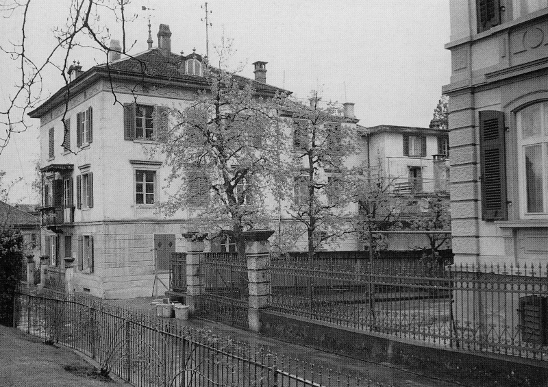 Häuser am Floraweg, Ansicht von Westen, in den 1960er Jahren. Rechts die Ecke der 1880 von Architekt Karl Schweizer erstellten Villa Flora. Links das Haus Schönau, Floraweg 7, abgebrochen 1969 für den Bau des Einkaufszentrums Coop. [pzi]