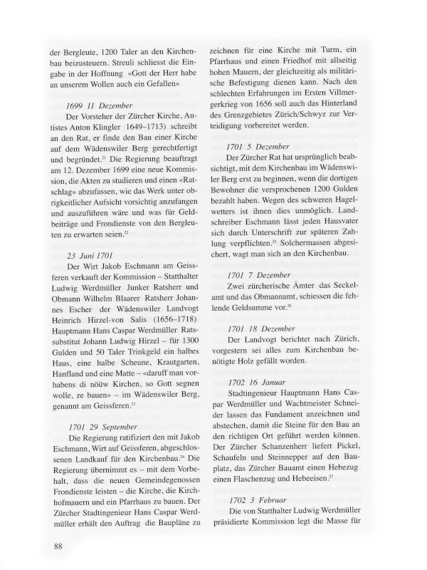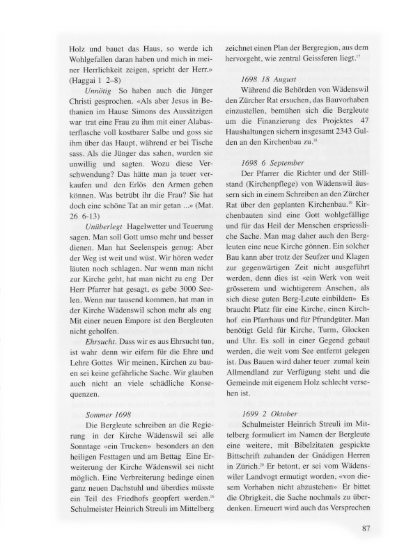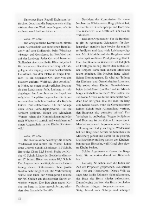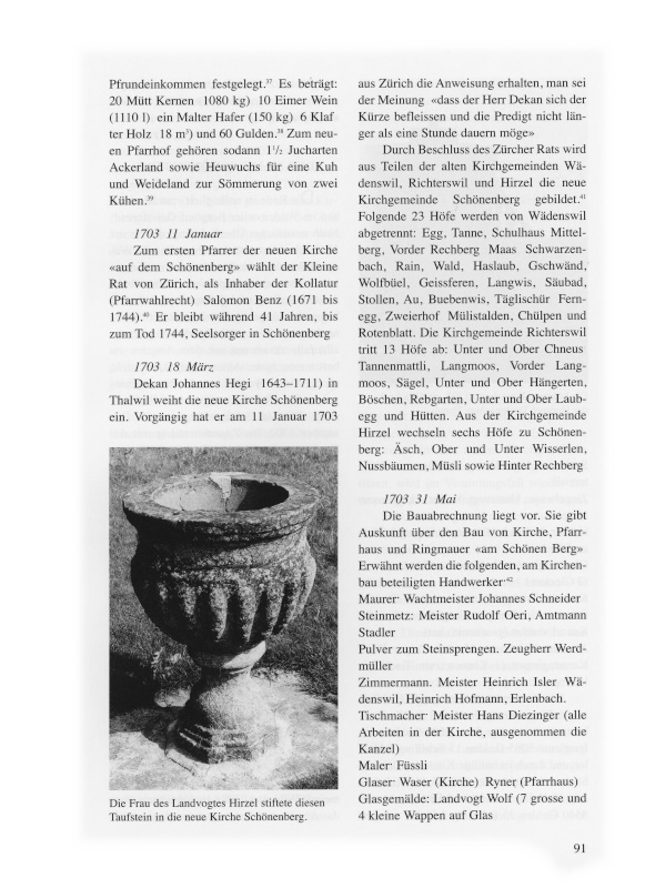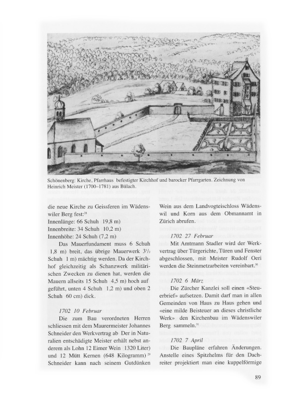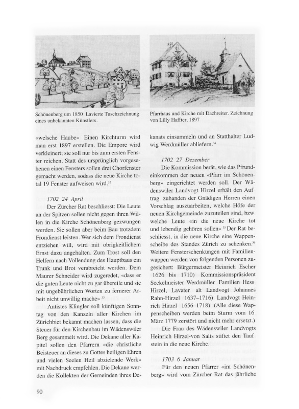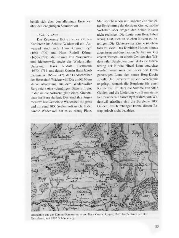 Als die Bevölkerungszahlen anstiegen und in den Dörfern und deren Aussenwachten ein Gemeinschaftsbewusstsein erwachte, strebten die Bewohner den Bau einer eigenen Kirche und die Bildung einer selbständigen Kirchgemeinde an. 1620 löste sich Hirzel von Horgen, 1680 am rechten Seeufer Uetikon von Meilen, und 1702 baute Wollishofen eine Kirche und trennte sich von Kilchberg.2 Es gab damit Vorbilder in der Gegend, die auch im Wädenswiler Berg, dem heutigen Schönenberg, den Entschluss reifen liessen, sich von der Muttergemeinde Wädenswil abzuspalten.