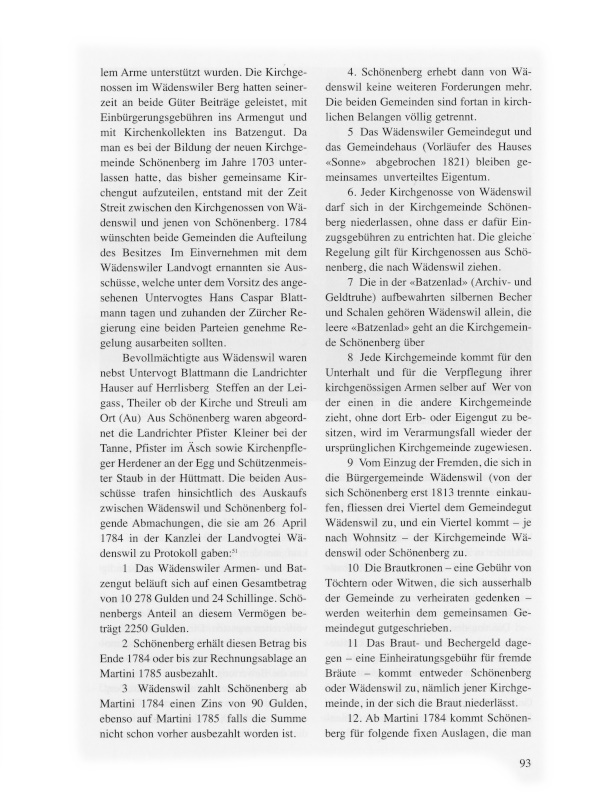 12. Ab Martini 1784 kommt Schönenberg für folgende fixen Auslagen, die man bisher gemeinsam bestritten hat, allein auf: Abendmahlswein, Wartegeld für die Hebamme, Läuterlohn für den Schulmeister, Spesenvergütung an den Pfarrer für das Abholen der für Bedürftige bestimmten Winterkleider in Zürich. Schönenberg zahlt ferner den vierten Teil der jährlichen Patrouillengelder für die Flur- und Nachtwache sowie einen Viertel der Kanzleikosten für die Abnahme der Rechnungen. |