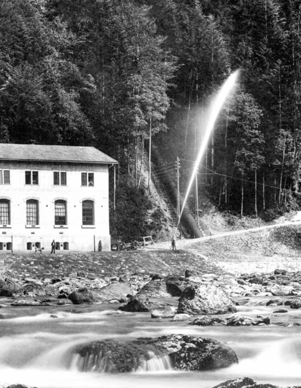 106 Das Maschinenhaus Waldhalde bei seiner Eröffnung 1895: Der Wasserstrahl aus dem Feuerwehrschlauch sollte die neue Kraft demonstrieren.