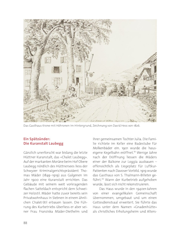 88 Das Gasthaus Krone mit Höhronen im Hintergrund, Zeichnung von David Hess von 1826.