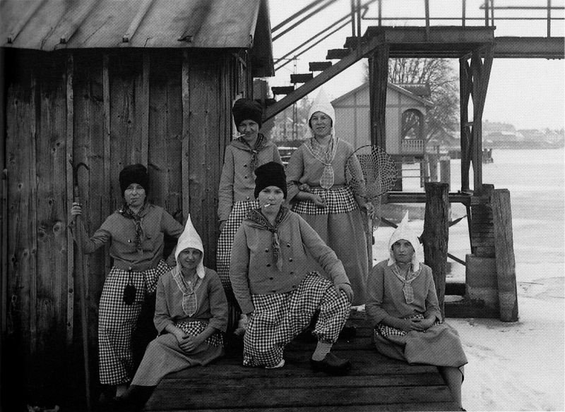 An der Fasnacht 1929 ist der Zürichsee zugefroren. Fasnächtlerinnen am Seeufer im Giessen, Blick Richtung Seeplatz.
